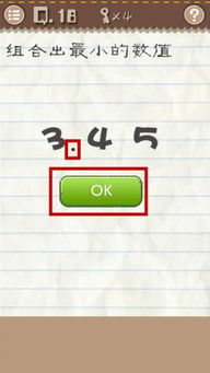 第18关的关卡要求是将三个数字5、3、4组合成最小的数值。对于很多玩家来说,这看起来似乎很简单,因为按照常规思维,将数字从小到大排列,即345,应该是最小的数值。事实并非如此。