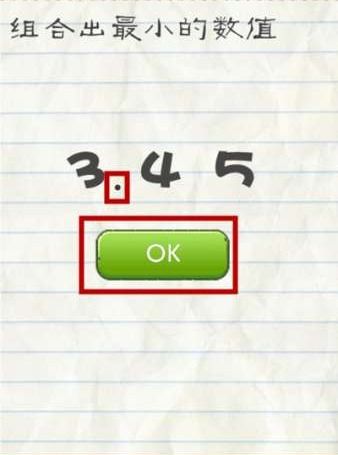 仔细观察关卡提示,会发现最后的句号实际上是一个小数点。在游戏中,这个小数点是一个隐藏的道具,可以用来改变数字的大小。将小数点拖动到数字3的后面,就可以形成3.45这个数值。在这个关卡中,3.45就是最小的数值。